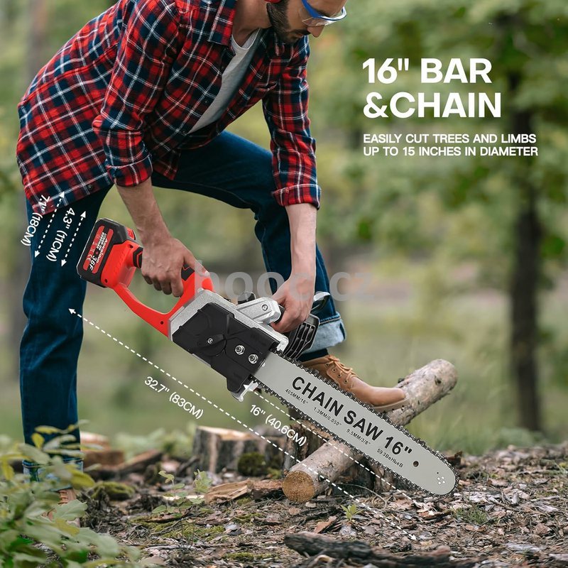 Pila disponuje 16ti palcovou lištou, dvěmi výkonnými akumulátory 6500mAh o napětí 21V kompatibilní s Makita, bezklíčovým napínáním řetězu, brzdou, s automatickým přímazem řetězu, displejem o stavu baterie. Výrobce uvádí, že pila vydrží řezat až 1,5h celkem tedy 3h po výměně akumulátoru. Akumulátor je podstatně vyšší než standardní a má vyšší výkon.